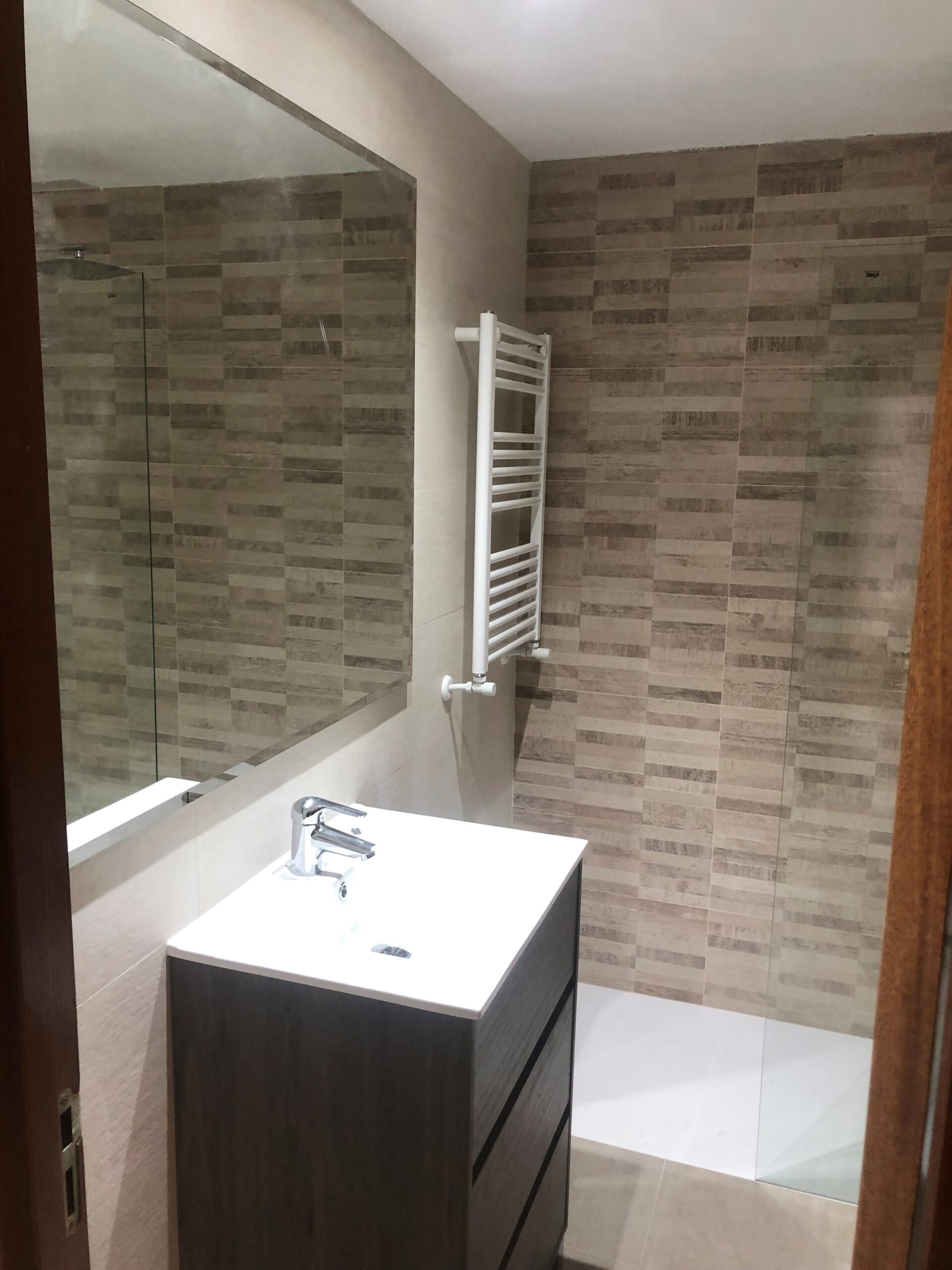 Antes y después – Mínima obra para cambio de bañera por plato de ducha con mampara abierta y perfil de transición